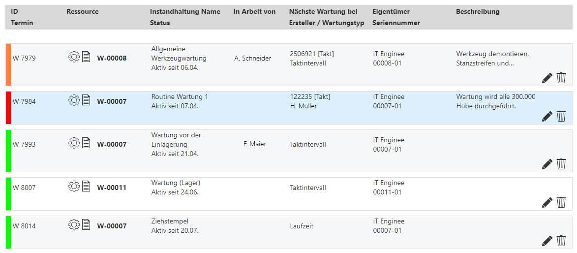 Der integrierte Wartungsmanager überwacht automatisch, wann eine Wartung, Instandhaltung oder Inspektion ansteht. Er erzeugt rechtzeitig einen Wartungsauftrag beim Erreichen des Wartungszyklus. Entsprechend der definierten Wartungsvorschau wird der anstehende Wartungsauftrag im Maschinen- bzw. Werkzeugbau angezeigt. So wird keine Wartung mehr übersehen, und die Instandhaltung kann vorausschauend geplant werden.